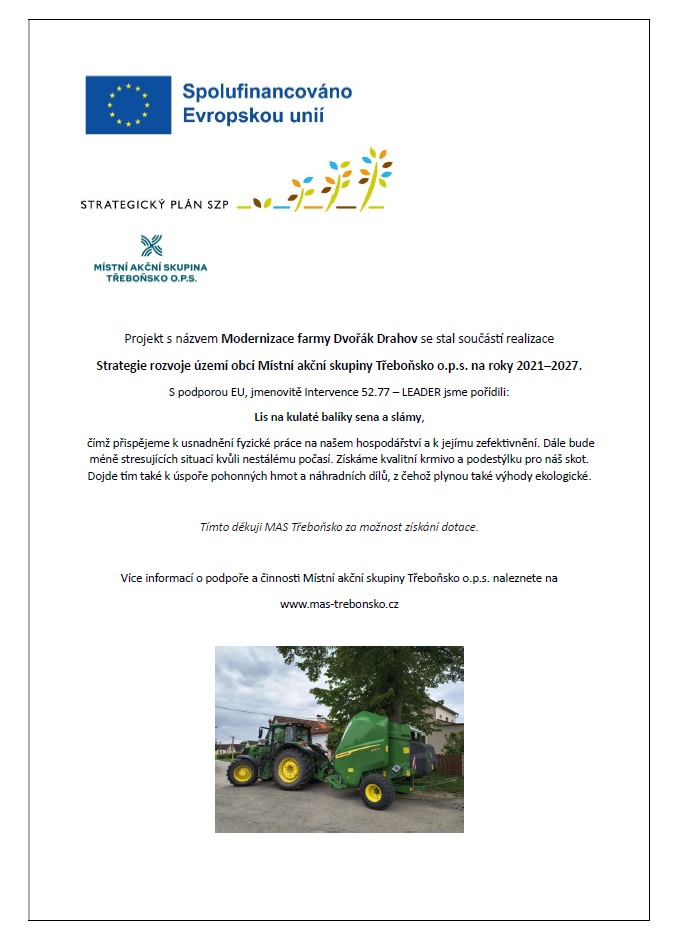 Projekt s názvem Modernizace farmy Dvořák Drahov se stal součástí realizace