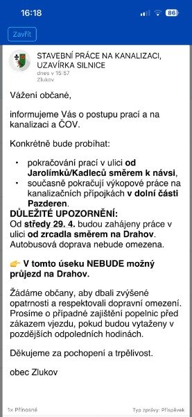 POZOR !!! SILNICE Z DRAHOVA NA ZLUKOV BUDE OD KONCE DUBNA AŽ ZHRUBA CELÝ KVĚTEN UZAVŘENÁ!!!